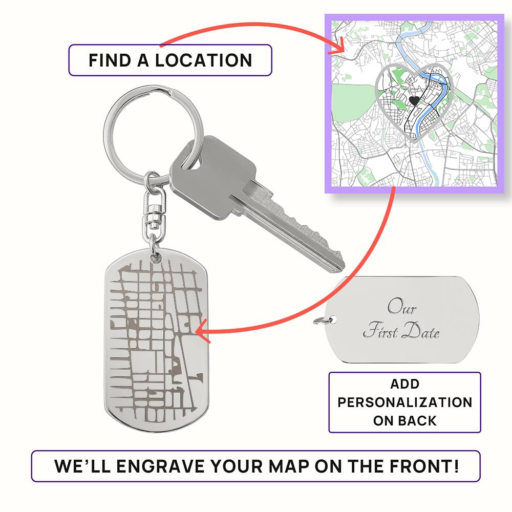 Capture the coordinates of your heart with our Engraved Dog Tag Map Keychain — a timeless keepsake designed to honor the places that shaped your life.